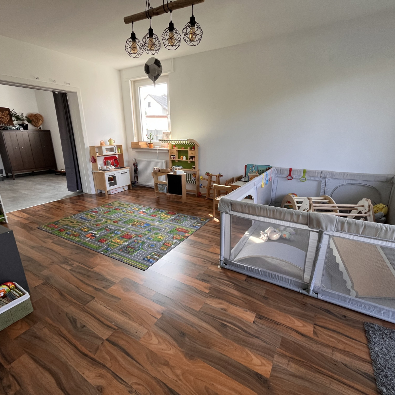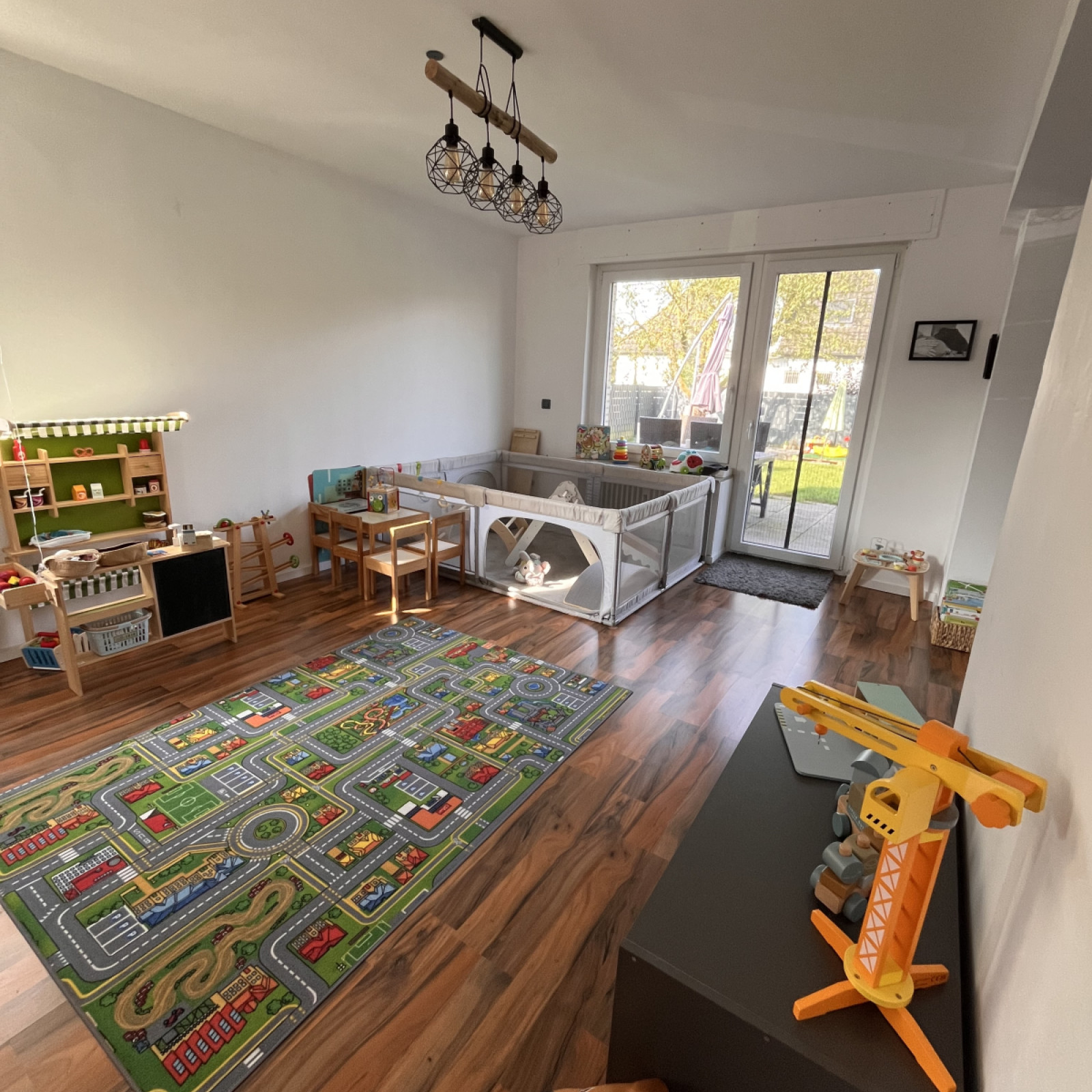 Der schöne große Gruppenraum ist durch die vielen Fenster und die Einrichtung sehr hell und freundlich. Ich versuche in den Räumlichkeiten stets eine gemütliche, sanfte und fröhliche Wohlfühlatmosphäre für die Kinder zu schaffen. Außerdem achte ich darauf, dass die Umgebung der Kinder viele Fähigkeiten fördert.